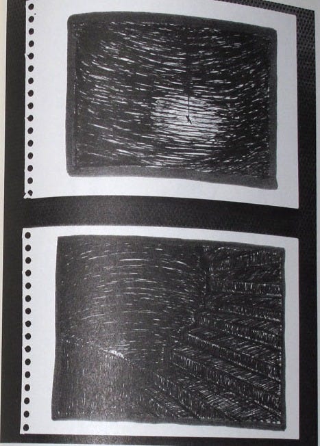 Appendix II started off by displaying sketches of the labyrinth likely drawn by Zampanò. They predominantly featured stairs in eerily dark spaces. The creepiest one illustrated a tiny stick-figure of a man dangling on a rope over a vast expanse of nothingness. One of them even contained the specs for the ¼” discrepancy from Chapter 4. A collection of polaroids of different houses, including a church, was also featured in this section.